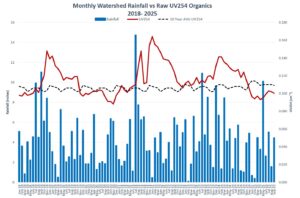 Data shows that high amounts of precipitation are followed by spikes in the amount of natural organic matter (measured by UV254) in Cobble Mountain Reservoir. In fall 2024 NOM levels were down from more elevated levels in winter (December 2024-February 2024). In early 2025 NOM levels remained below the 10-year average but continue to fluctuate.