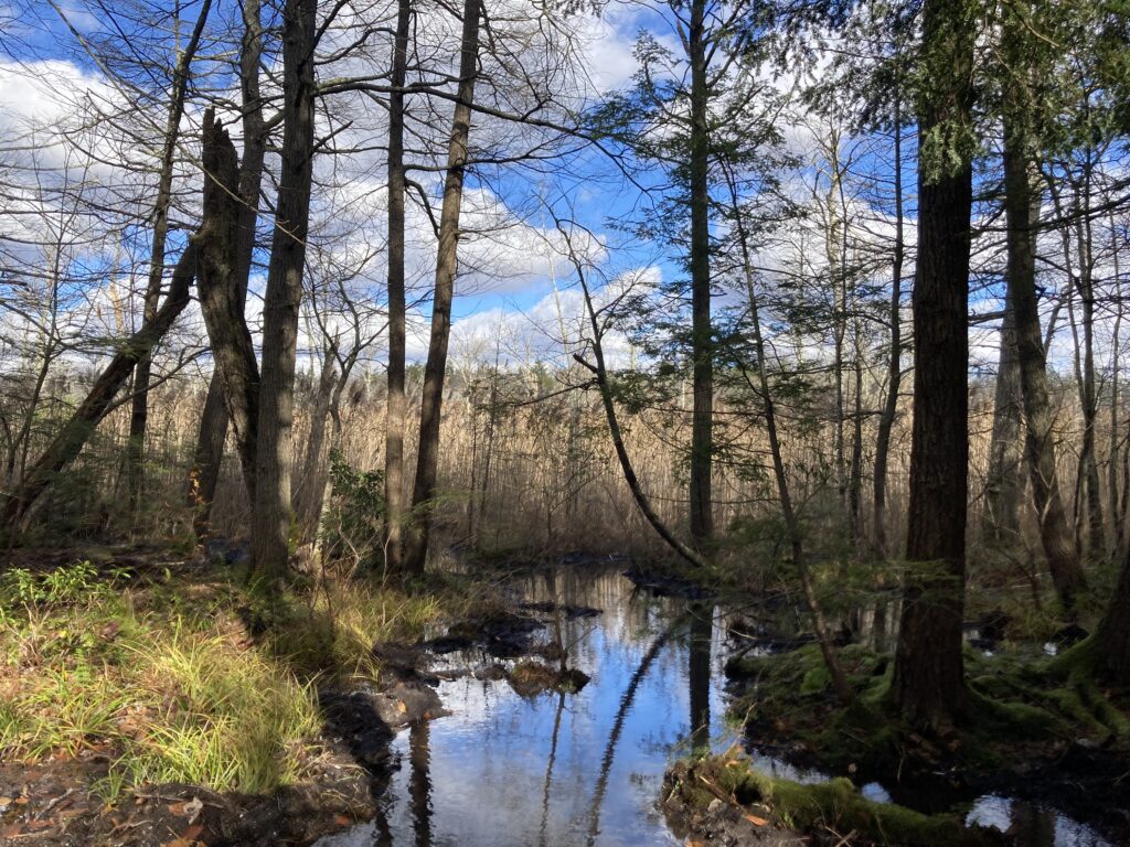 A large wetland encompasses the western part of the property. Beaver have made their home here, and you can see evidence of their presence in the downed trees along the forest’s edge.
